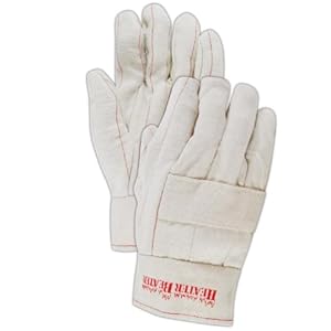 Product Description : Magid Heater Beater Hot Mill Gloves are the standard for metal workers across the country. Made from a 28 oz. 100% cotton triple layer construction he Magid? Hot Mill series keeps out the heat and provides superior comfort and protection. All styles feature a knuckle strap, soft nap out later and pull patch for added protection. Featuring a natural color with red stripes, this clute cut glove is USDA accepted and has a 2" band top cuff for easy donning and doffing.
