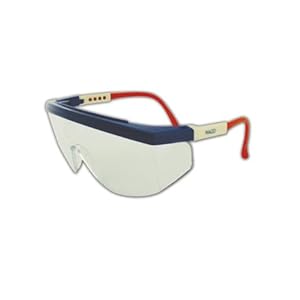 Vendor: Red, white, and blue nylon frame with brow guard and molded side shields for extended facial protection Untinted, polycarbonate