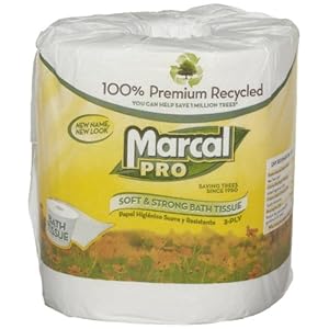 Product Description : MarcalPro 100% Recycled 2 ply Bath Tissue with the long lasting 504 sheet roll needs fewer changes saving you time and money. Manufactured without chlorine bleach, dyes or fragrances. Meets EPA guidelines for recycled post consumer content making it the best choice. Each roll is individually wrapped keeping the bath tissue clean and sanitary. Packed 48 individually wrapped rolls per poly bundle. Made in the USA. Marcal, a friend to trees since 1950. We make paper from paper, not from trees!